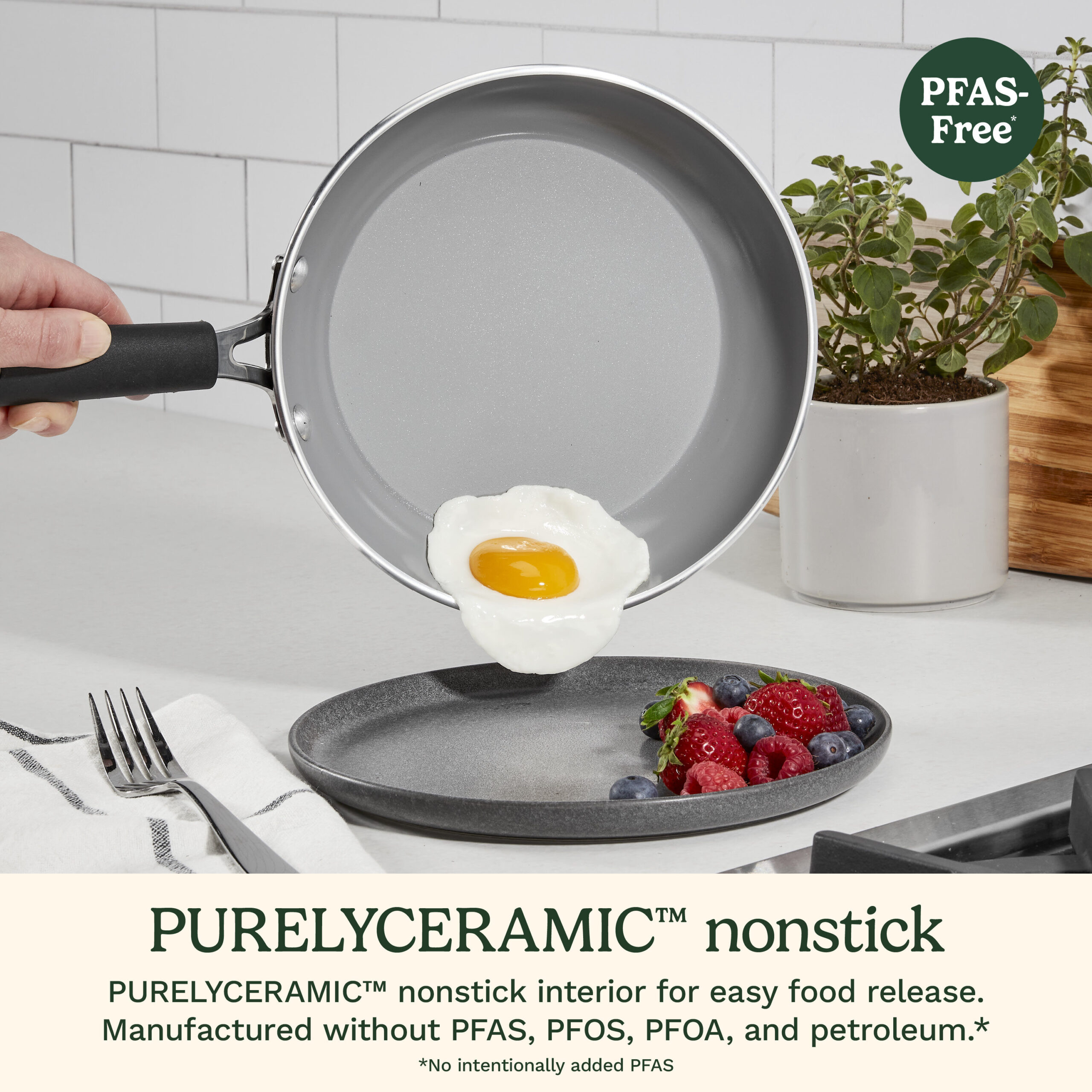 This durable forged aluminum cookware set delivers exceptional heat distribution and long-lasting performance. Featuring our advanced PURELYCERAMIC? nonstick release system, it ensures effortless food release and easy cleanup??without the use of PFAS, PFOS, PFOA, or petroleum*. The sleek silicone handles, accented with a stainless badge, offer a comfortable grip and modern aesthetic, while the tempered glass lids provide clear visibility and secure sealing. Designed for convenience, the set is dishwasher safe and oven safe up to 350??F, making it a versatile addition to any kitchen. Set Includes: 1.5 Qt. Saucepan with Cover, 2.5 Qt. Saucepan with Cover, 3 Qt. Saut?? Pan with Cover, 6 Qt. Stockpot with Cover, 8?? Skillet, 10?? Skillet, 10cm Steamer Insert.
