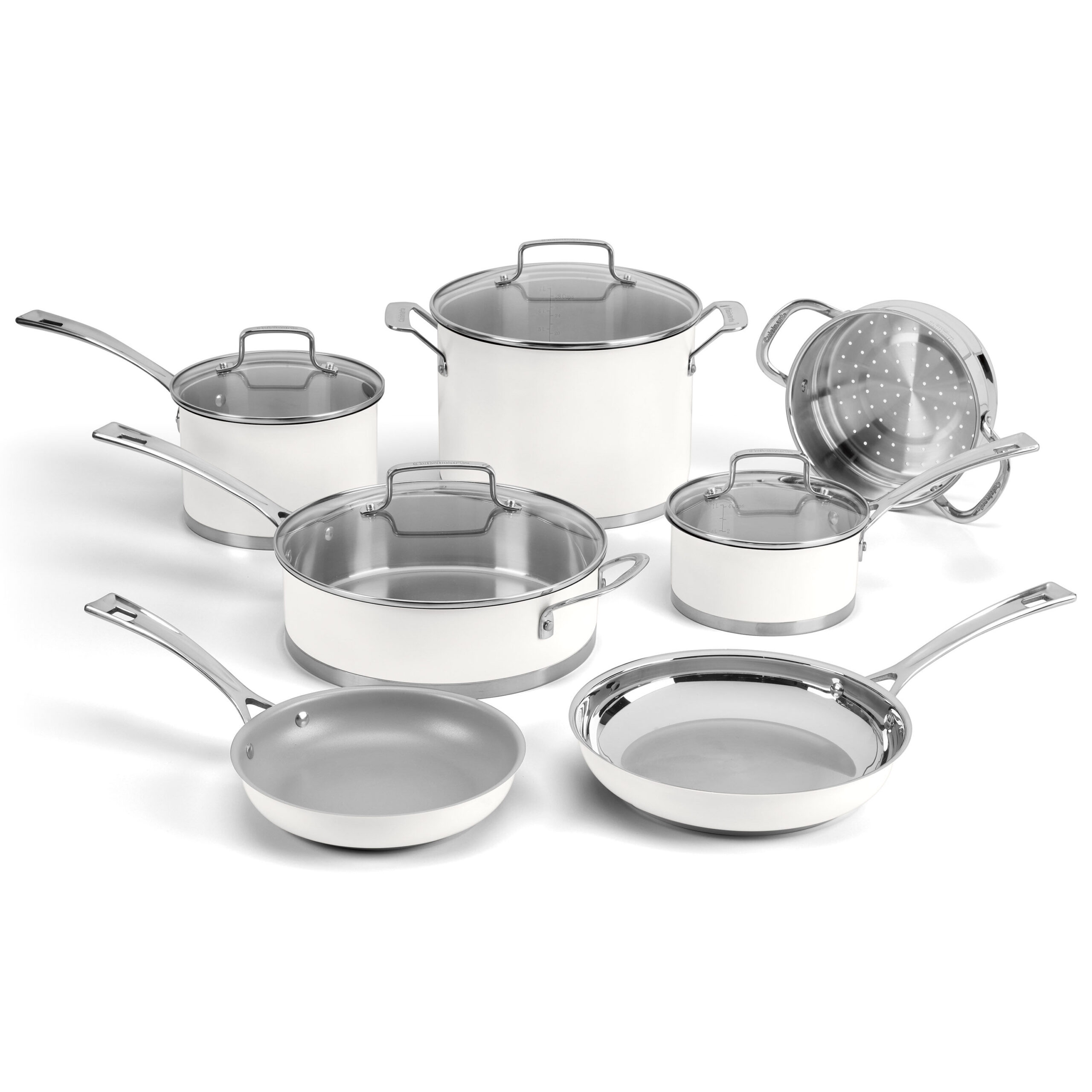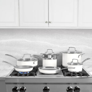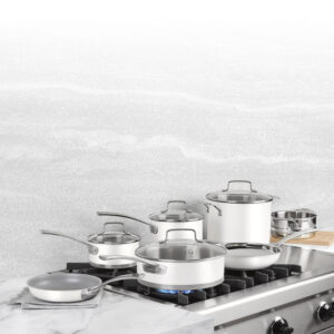 This premium 11 piece set includes all of the cookware essentials for classic cooking techniques like slow simmers, delicate browning and reduction of liquids and is also oven safe. This set features an impact bonded aluminum encapsulated base for fast and even heating. Stainless steel cooking surface does not become discolored, react with foods, or alter flavors. This cookware is dishwasher safe so cleanup is conveniently hassle free. A beautiful white matte exterior brightens up your kitchen and complements any kitchen d??cor. Set includes: 1.5 Qt. Saucepan w/ lid, 3 Qt. Saucepan w/ lid, 4 Qt. saute pan w/ helper handle and lid, 8 Qt. Stockpot w/ lid, 8″ PURELYCERAMIC? nonstick skillet, 10″ skillet, Steamer insert