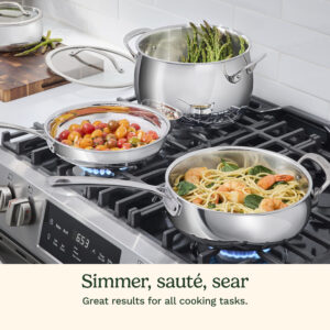 Crafted for both beauty and performance, Cuisinart??s PureClad? Triple-Ply 12-Piece Stainless Steel cookware blends elegance with professional-grade quality. The luxurious, rounded full-body design enhances any kitchen, while the triple-ply stainless steel construction ensures durability and timeless appeal. Experience precise and even heat distribution with Heat Surround? technology, where an aluminum core extends from the pan??s base up the sidewalls for flawless cooking results. Stay in control with cast stainless steel Cool Grip? handles that remain cool to the touch, offering comfort and security. The tempered glass lids, framed with sleek stainless steel and wide handles, lock in moisture and flavor. The sealed, dripless rims ensure effortless, mess-free pouring and make cleanup a breeze in the dishwasher. Compatible with all stovetops, including induction, and oven-safe up to 500??F (450??F for lids), this cookware is as versatile as it is timeless??ready to elevate every meal you make. Set Includes: 1.5 Qt. Saucepan with Cover, 3 Qt. Saucepan with Cover, 3.5 Qt. Covered Saute Pan with Helper Handle and Cover, 8 Qt. Stockpot with Cover, 8″ Skillet with Cover, 10″ Skillet, Universal Steamer Insert.