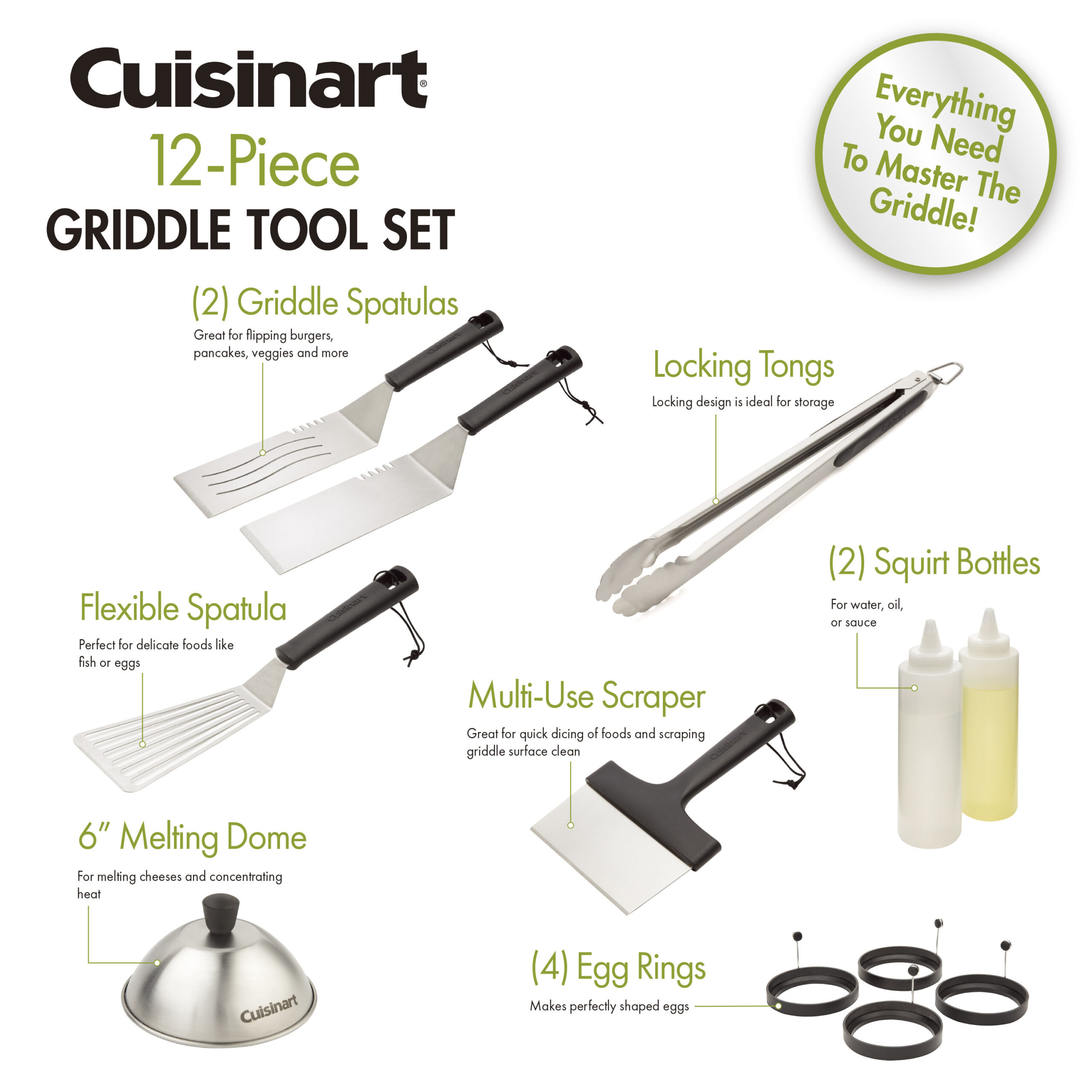 The Cuisinart 12 Piece Griddle Set provides you with everything you need to master the griddle! This comprehensive set features 2 griddle spatulas, a flexible spatula, locking tongs, multi-purpose scraper, 6″ melting dome, 2 squirt bottles, and 4 silicone egg rings. The griddle spatulas include one solid and one perforated spatula for handling anything you throw on the griddle. The perforated design allows for excess grease to drip through for healthier cooking. The flexible spatula is ideal for more delicate food like seafood, eggs, pancakes, or veggies. Use the multi-purpose scraper for quick chopping on the griddle surface or a quick cleaning in between rounds of food. The 4 silicone eggs rings will help you create perfectly shaped eggs for bacon and eggs or egg sandwiches and the non-stick material easily slides off, keeping your eggs in tact. The 6″ melting dome is ideal for melting cheese on burgers or concentrating heat to speed up cook times. What griddle set is complete with out squirt bottles? The translucent bottle are ideal for keeping water and oil handy while griddling.