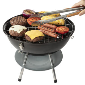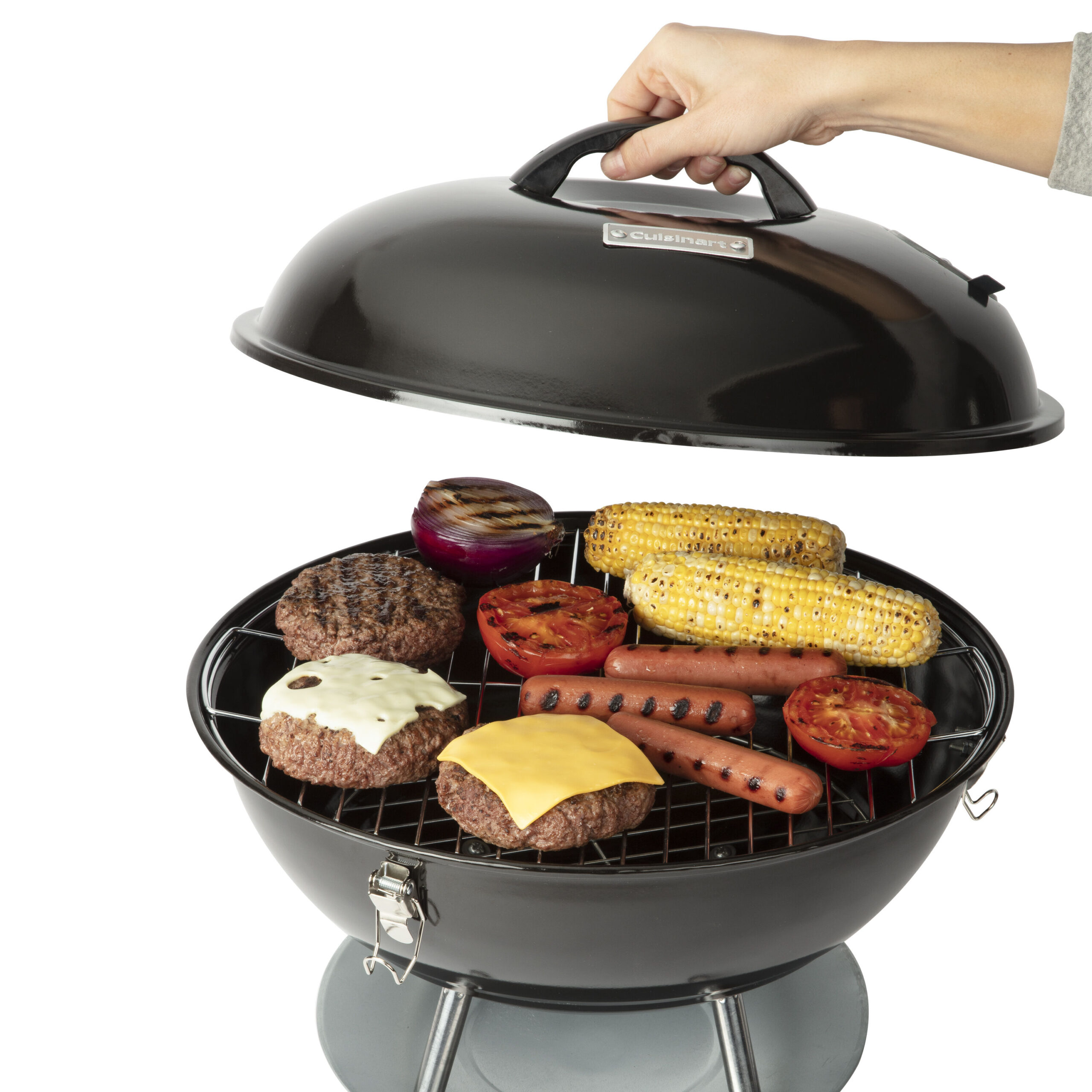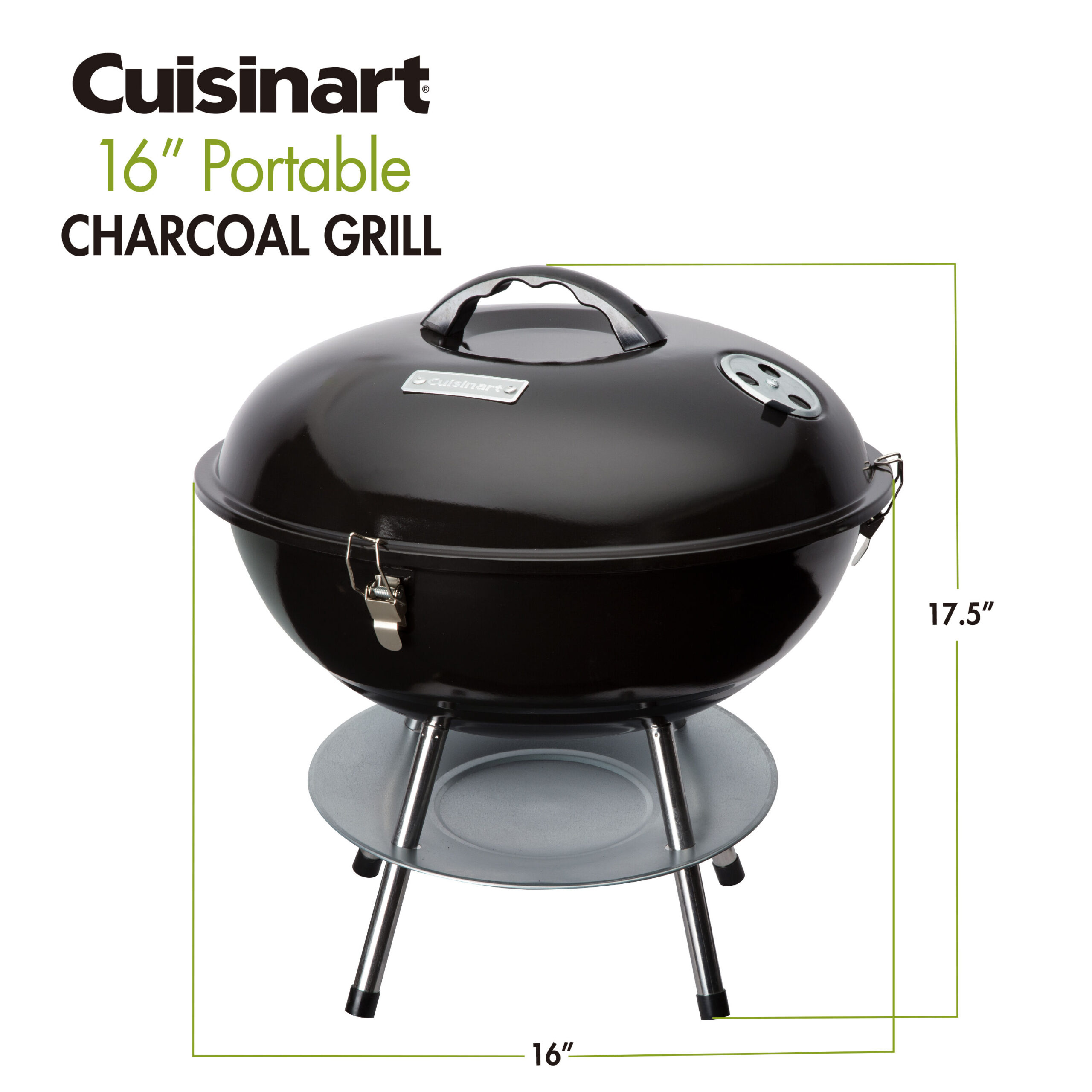 The Cuisinart? 16″ Portable Charcoal Grill offers the perfect solution for easy grilling when camping, tailgating, or at home! This compact grill is lightweight and easy to transport, featuring locking latches that keep the lid secured to the body. The 4-legged design is ideal for stability while grilling, ensuring your grill wont rock or tip during use. Controlling temperature is so important when cooking with charcoal, so that is why the Cuisinart? 16″ Portable Charcoal Grill features a dual vent system with an air inlet vent on the bottom of the fire bowl and an air exhaust vent on the lid. The ash catcher below the fire bowl protects the surface beneath your grill from any hot bits of charcoal that may fall through while cooking.