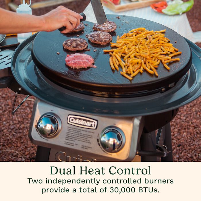 The Cuisinart 360?? Griddle Outdoor Cooking Center is the ultimate all-in-one outdoor cooking station, delivering 30,000 BTUs of power across a 22-inch round carbon steel cooking surface. Whether you’re making breakfast, lunch, or dinner, this flat top griddle lets you grill, steam, roast, bake, and smoke with ease. Cook all your favorite meals including steak, fried rice, fajitas or pancakes, the options are limitless. The stainless steel vented lid adds cooking versatility, while the 360?? grease management system ensures hassle-free cleanup. With dual heat zones, a folding prep table, and quick assembly, this outdoor griddle grill is designed for effortless cooking at any BBQ, cookout, or tailgate.