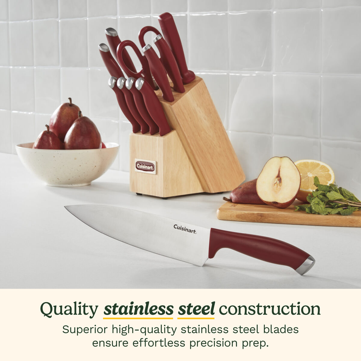 Let the Cuisinart? Classic ColorPro Collection inspire your inner chef with premium cutlery crafted from durable, high-carbon stainless steel. Precision blades that taper to an ultra-sharp, fine edge ensure superior performance, so every cooking task can be completed with ease. Sleek handles, custom contoured for ergonomic comfort, make each knife effortless to control and enable everyone, from kitchen novice to the seasoned chef, to create mealtime masterpieces.