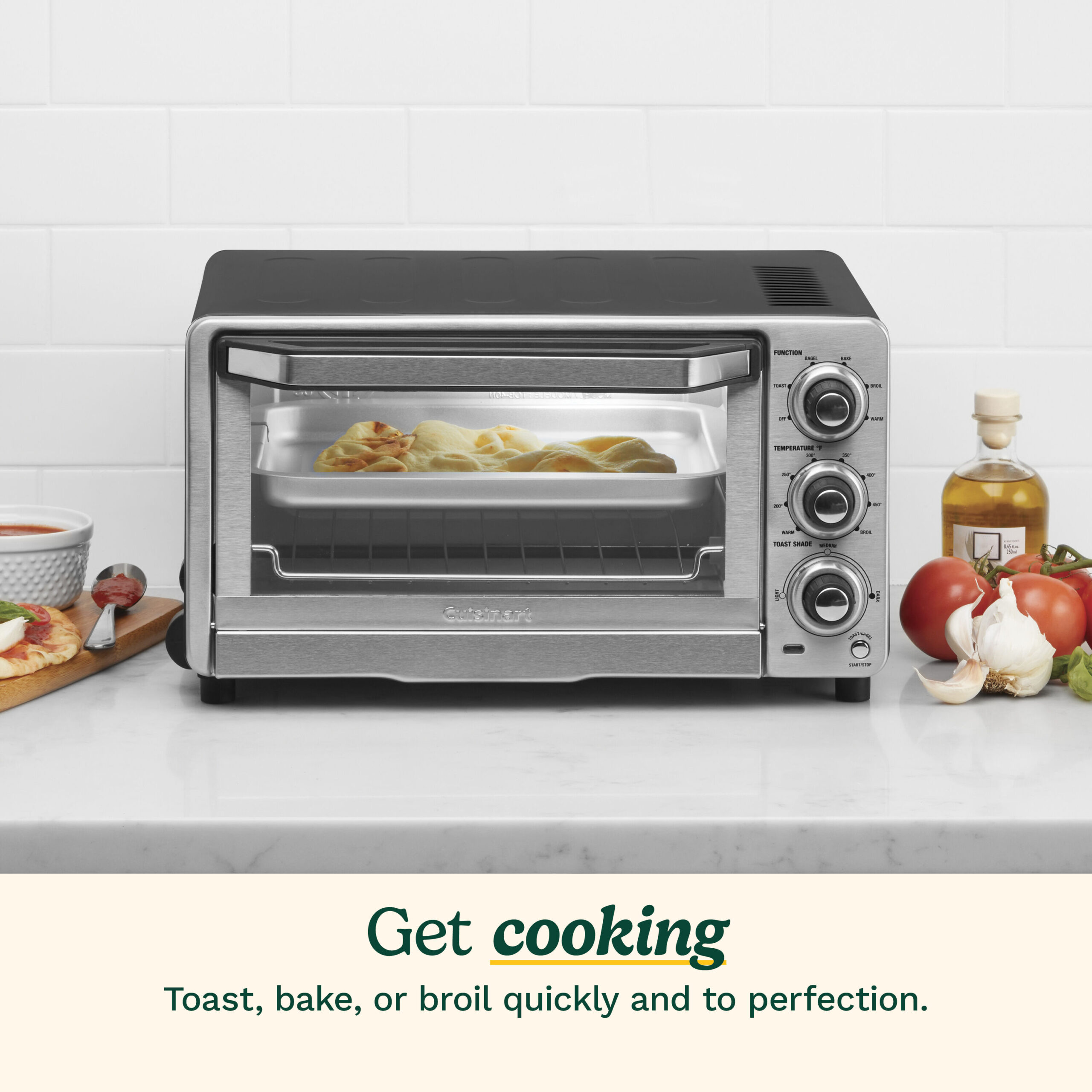 Compact cooking versatility and modern design make this countertop Custom Classic? Toaster Oven Broiler an ideal choice for your lifestyle. Brushed stainless and black housing is outfitted with a wire rack, broiling rack and baking/drip pan to handle your toasting, baking, and broiling needs. The Always Even? Shade Control monitors the toasting temperature and will automatically adjust the timing to produce the desired toast every time; auto slide-out rack means convenient, hands-free loading and removal of foods.