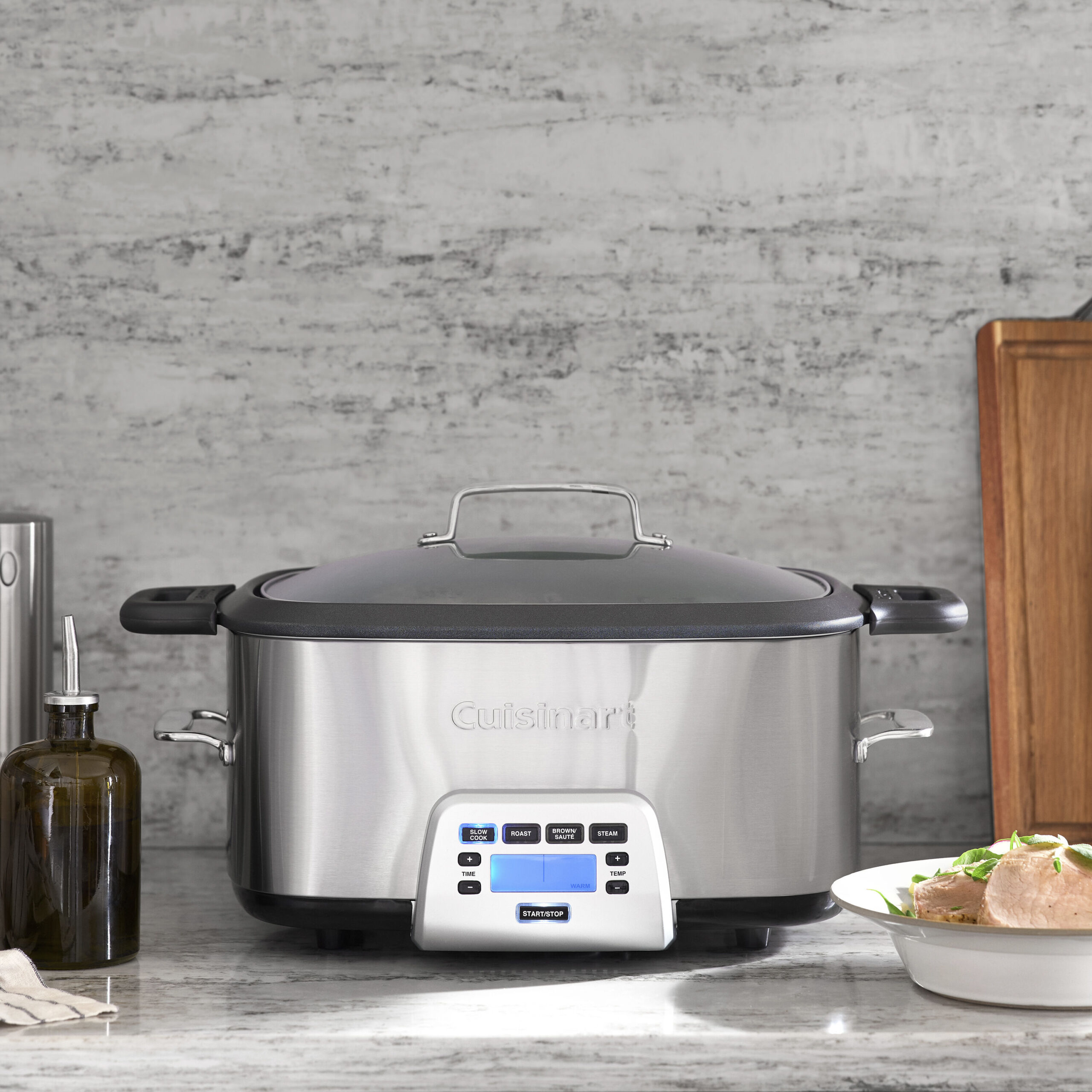 With the Cuisinart? 7-Quart Cook Central? Multicooker, you can do it all without firing up the stovetop. Brown ingredients in the Cook Central? and then Roast or Slow Cook with one button for effortless one pot combination cooking. Presets, time, and temperature controls make it simple to Slow Cook, Roast, Brown/Saut??, or Steam alone, or in combination! The Cook Central? makes dinnertime easy and programmed ahead of time so your meal is done exactly when you want it, with the Keep Warm feature making sure heavy commuter traffic doesn??t mean your meal will be cold! The cast aluminum pot is also removable and nonstick for easy clean up, no matter how slowly you roast sticky pulled pork.