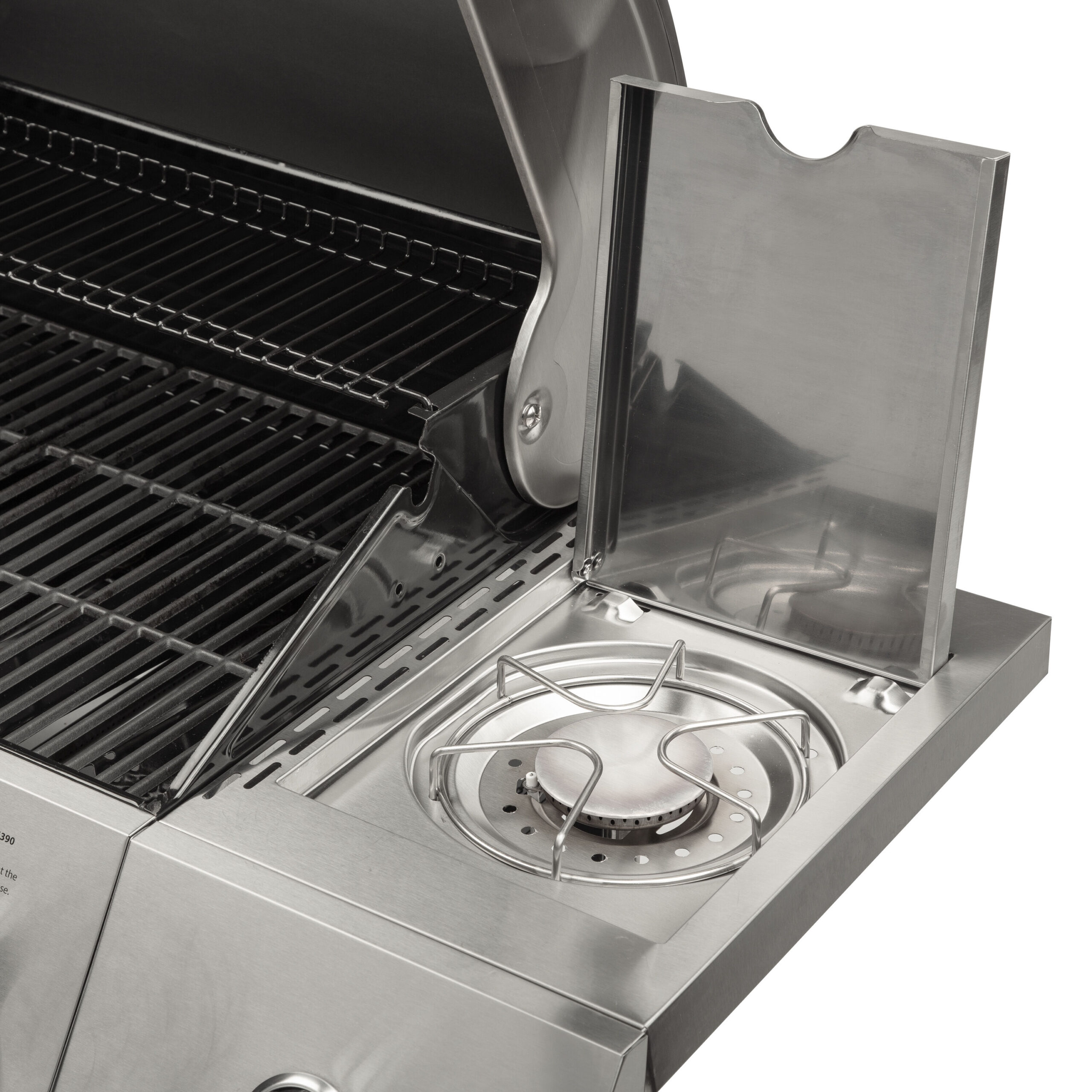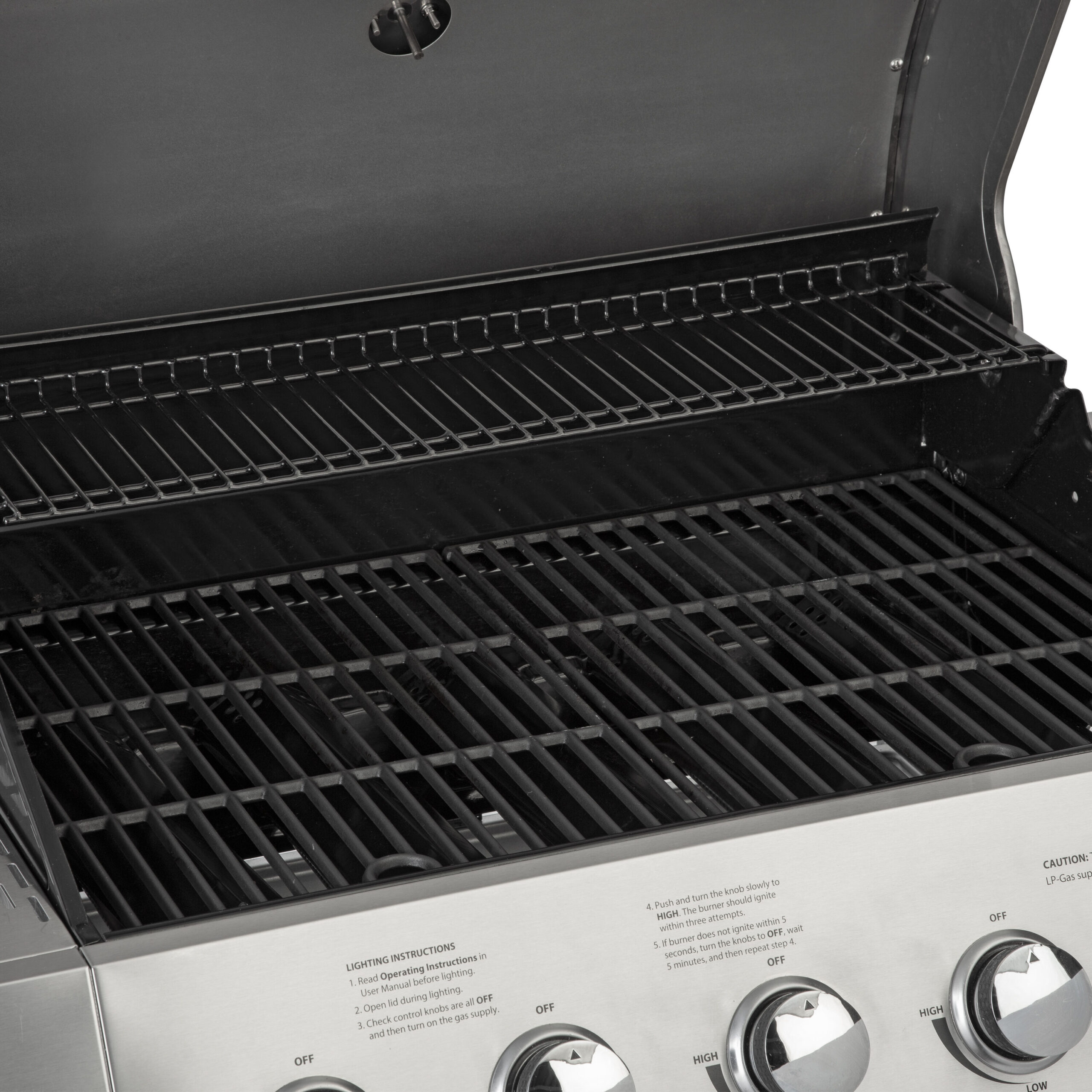 The Cuisinart? 5-Burner Gas Grill is the perfect BBQ for any level of griller! The 5 independently controlled burners produce a total of 50,000 BTUs of cooking power spread evenly across the 460 square inch cast iron cooking surface. The grill is also equipped with an additional side burner that provides 12,000 BTUs and is great for stews, corn, clams and more. And if you’re looking for additional space, the warming rack above the cooking surface provides an additional 202 square inches. With a reliable and easy twist-to-start ignition your grill will start up time after time. And no grill is complete without side tables. The Cuisinart? 5-Burner Gas Grill has two 18-inch x 13-inch stainless steel side tables that allow for extra room while prepping and grilling. Unlock your inner griller with the Cuisinart? 5-Burner Gas Grill!