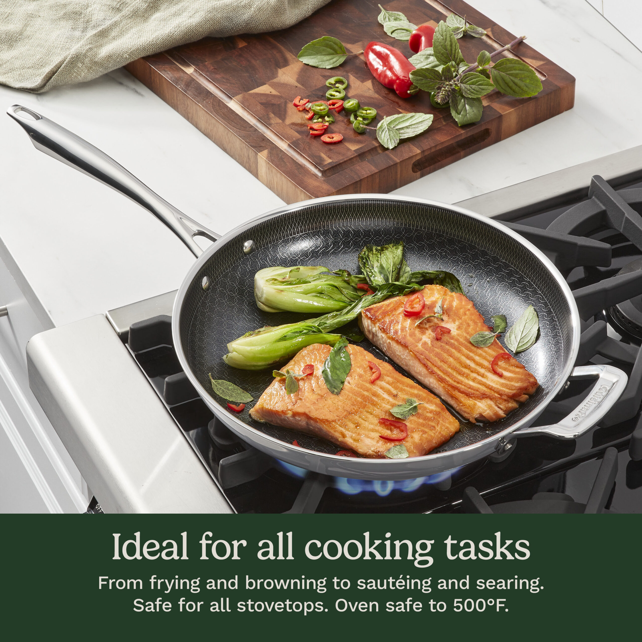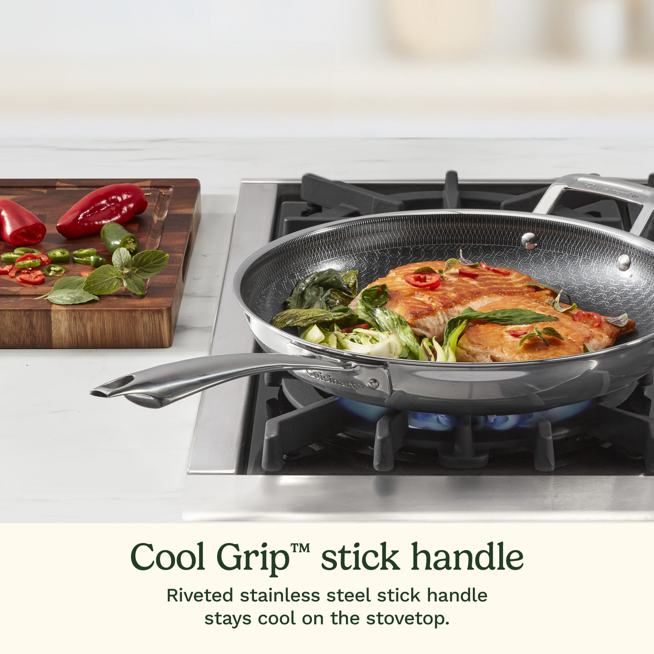 Transform your cooking experience with Cuisinart??s FusionElite+? Nonstick Tri-Ply Stainless Steel Cookware, featuring the innovative PURELYSEAR? Ceramic Nonstick Technology. This 12?? skillet is best for cooking larger meals, such as searing multiple steaks, saut??ing a big batch of vegetables, frying chicken, or preparing stir-fries. It ensures perfect searing and superior release, featuring a scratch-resistant ArmorGuard? interior, durable stainless steel construction, and an aluminum-encapsulated base for fast, even heat distribution. The riveted Cool Grip? stick handle stays cool on stovetop, and the tapered rim ensures drip-free pouring. Compatible with all stovetops, including induction, this PFAS-free, dishwasher-safe skillet comes with a lifetime warranty for lasting durability.