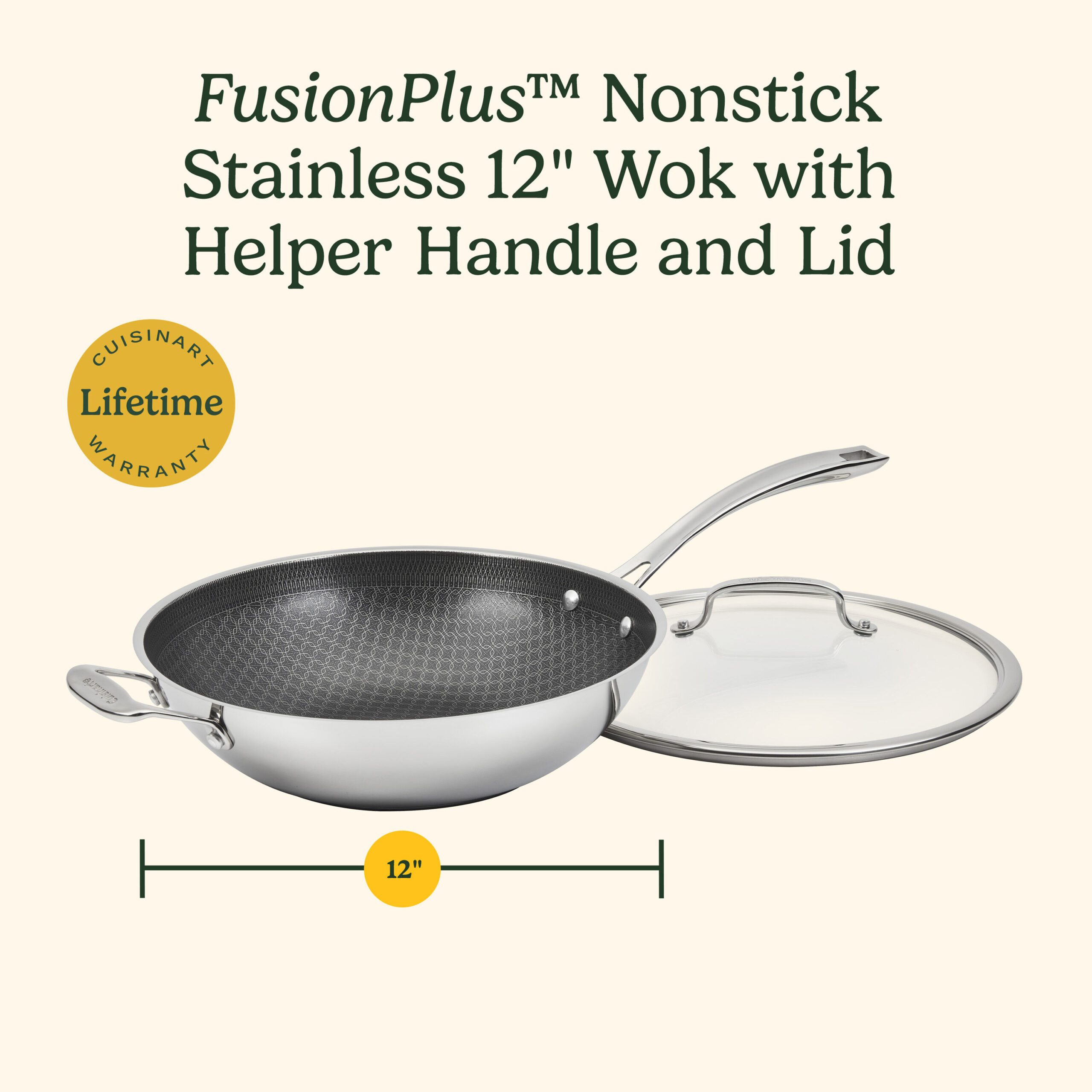 Elevate your everyday cooking with the Cuisinart? FusionPlus Nonstick Stainless Steel Wok with Lid and Helper Handle. The 12″ stainless steel wok features professional stainless steel construction and aluminum encapsulated base for even heating, making it ideal for saut??ing vegetables and preparing stir-fry, ensuring perfect searing and superior release. Cool Grip? handles stay cool to the touch, and the wok is both dishwasher safe and compatible with all stovetops, including induction.