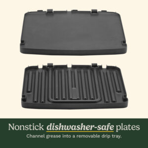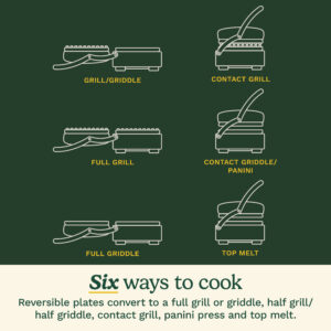 The Griddler? Elite boasts six impressive cooking functions in sleek brushed stainless steel that gleams on any kitchen countertop. This stylish electric grill can tackle any task, with the ability to grill, griddle, half grill, half griddle, panini press, and top melt sandwiches, meats, and appetizers. The electronic display lets you set a timer and dual zone temperature control, meaning you can griddle an egg on one plate while grilling bacon on the other across a generous 240 square inches of cooking surface. With reversible plates, our superior SearBlast? feature locking flavor into steaks at 500?F, and a top cover that is fully adjustable, cooking is perfectly customized and precise every time. The dishwasher safe nonstick grill plates are also conveniently removable for easy clean up after even the gooiest, cheesiest sandwich or sticky barbecue sauce.