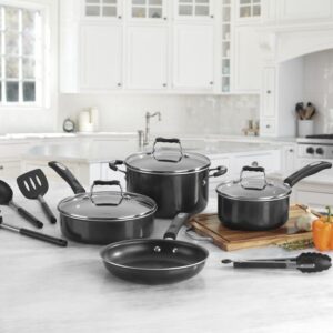 Nonstick construction heats quickly and distributes heat evenly, eliminating hot spots. Durable 3-layer nonstick cooking surface for healthier cooking. Lasting food release and easy cleaning. Handles are designed to provide a secure and comfortable grip. Riveted stick handles stay cool on the stovetop. Glass lids fit tight to lock in flavor, moisture and nutrients. Covers are made from tempered glass for superior durability. Glass lids are oven safe to 350??. Rims of cookware are tapered for convenient, drip-free pouring. Cookware is oven safe to 350??F and freezer safe for easy storage. Kitchen tools feature ergonomic handles and are dishwasher safe.