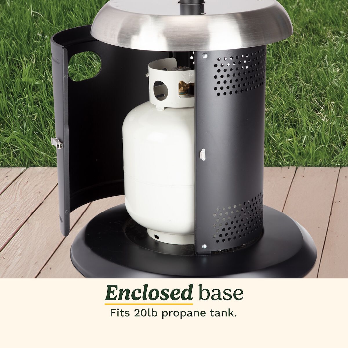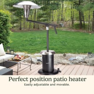 Stay warm and in control with the Cuisinart Perfect Position Propane Patio Heater, an overhead heater designed to direct heat exactly where you need it. Unlike traditional upright patio heaters, this innovative swivel-arm design lets you adjust the heat distribution from left to right, covering more space and maximizing comfort. When finished, fold the swivel arm down for compact storage. The 33?? heat shield and cone-shaped burner unit direct 38,200 BTUs of powerful heat downward and outward for optimal warmth. Built for convenience, the enclosed base discreetly stores a 20 lb. propane tank and offers easy-access controls. A built-in stainless steel drink table adds functionality and style, making it a perfect addition to any patio. With a 50 lb. weighted wheeled base for mobility, you can easily move warmth wherever it’s needed. Rotate, relax, and stay cozy with the Perfect Position Propane Patio Heater.