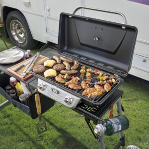 The Cuisinart Prep ‘n Go Folding Gas Grill is designed for ultimate portability, food prep, storage, and cooking all in one. When folded, the grill measures 27.8″ L x 22.3″ D x 15.1″ H, making it the most compact tri-fold grill available??saving valuable trunk space for other essentials. Cook up to 17 burgers at once with 285 sq. in. of cooking space on durable cast iron grates. With 18,000 BTUs of cooking power, this portable gas grill is perfect for camping, tailgating, or any on-the-go grilling. The large 24″ x 12″ prep table eliminates the need for a separate table, giving you plenty of room for food prep and staging. A removable storage tote underneath the prep area keeps your party essentials like plates, bowls, and utensils organized, and folds away with the grill when you??re done. The wheels and built-in handle allow for easy mobility, so you can easily wheel the grill to your campsite, tailgate, or backyard gathering.
