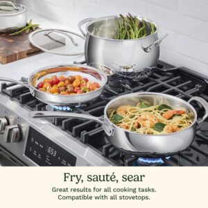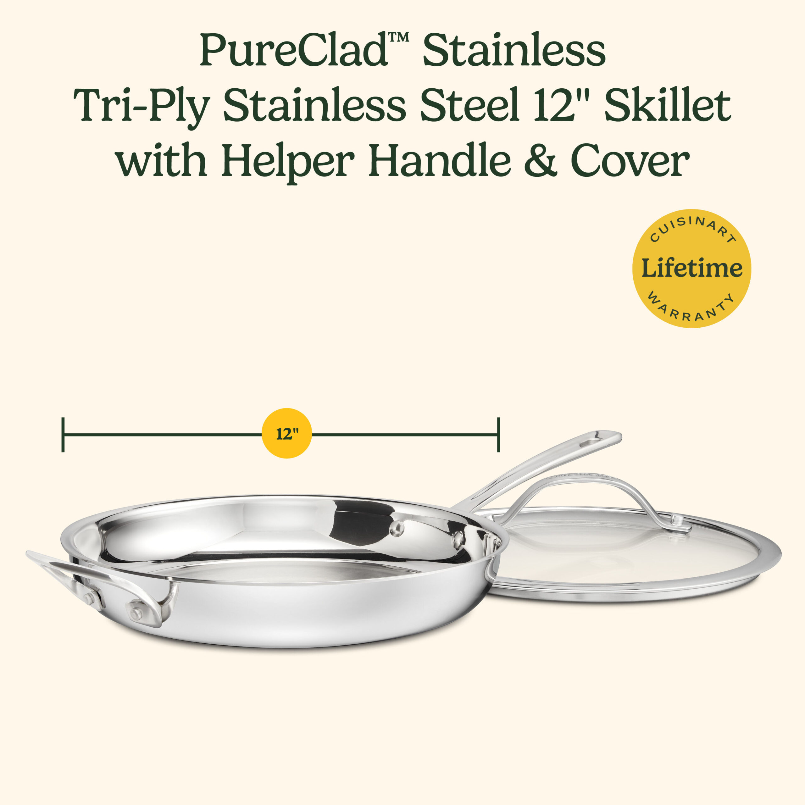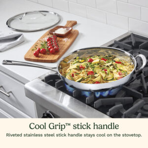 Crafted for both beauty and performance, Cuisinart??s 12″ PureClad? Triple-Ply Stainless Steel Skillet with Helper Handle and Cover blends elegance with professional-grade quality. The luxurious, rounded full-body design enhances any kitchen, while the triple-ply stainless steel construction ensures durability and timeless appeal. Experience precise and even heat distribution with Heat Surround? technology, where an aluminum core extends from the pan??s base up the sidewalls for flawless cooking results. Stay in control with cast stainless steel Cool Grip? handles that remain cool to the touch, offering comfort and security. The tempered glass lids, framed with sleek stainless steel and wide handles, lock in moisture and flavor. The sealed, dripless rims ensure effortless, mess-free pouring and make cleanup a breeze in the dishwasher. Compatible with all stovetops, including induction, and oven-safe up to 500??F (450??F for lids), this cookware is as versatile as it is timeless??ready to elevate every meal you make.