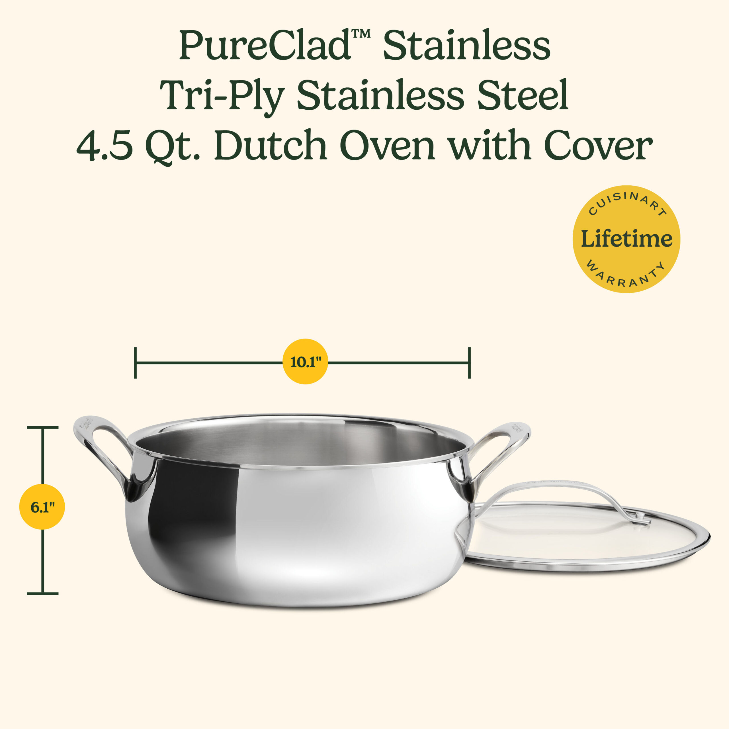 Crafted for both beauty and performance, Cuisinart??s 4.5 Qt. PureClad? Triple-Ply Stainless Steel Dutch Oven with Cover blends elegance with professional-grade quality. The luxurious, rounded full-body design enhances any kitchen, while the triple-ply stainless steel construction ensures durability and timeless appeal. Experience precise and even heat distribution with Heat Surround? technology, where an aluminum core extends from the pan??s base up the sidewalls for flawless cooking results. Stay in control with comfortable wide-grip handles. The tempered glass lids, framed with sleek stainless steel and wide handles, lock in moisture and flavor. The sealed, dripless rims ensure effortless, mess-free pouring and make cleanup a breeze in the dishwasher. Compatible with all stovetops, including induction, and oven-safe up to 500??F (450??F for lids), this cookware is as versatile as it is timeless??ready to elevate every meal you make.