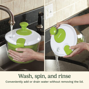The Small Salad Spinner from Cuisinart? allows you to wash and dry salad greens in the spinner without removing the lid. Add and drain water through the opening in the top. Easy-to-turn spin knob. Locks to securely close the spinner/ nonskid base.