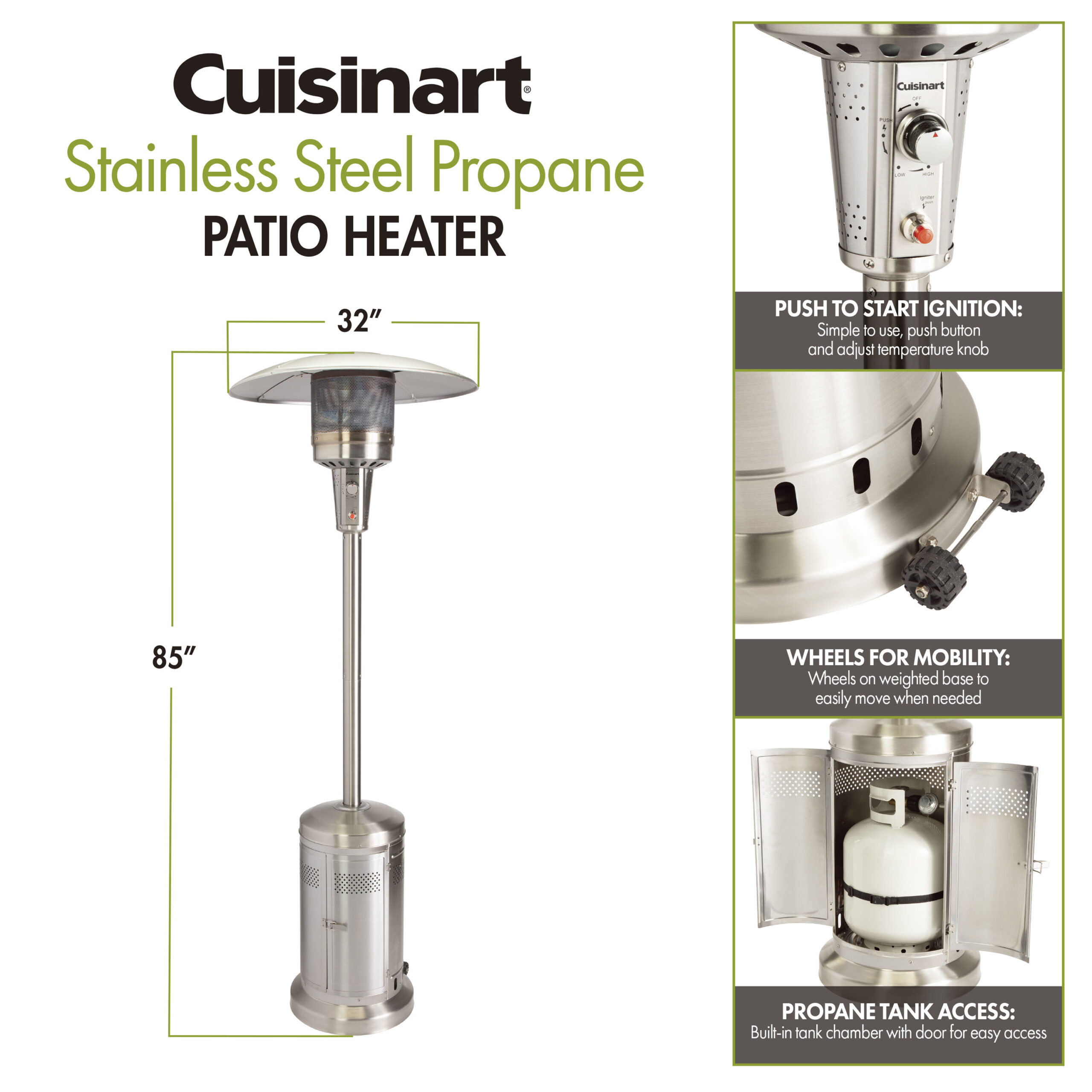 Enjoy your outdoor deck and patio well into the chilly fall nights with the Cuisinart? Patio Heater. This durable stainless steel heater’s high output is 47,000 BTU and with a simple press of a button…